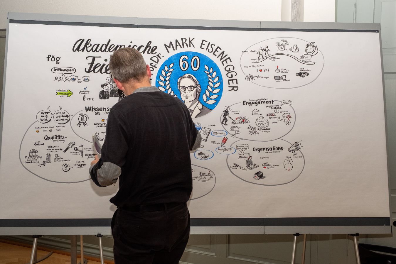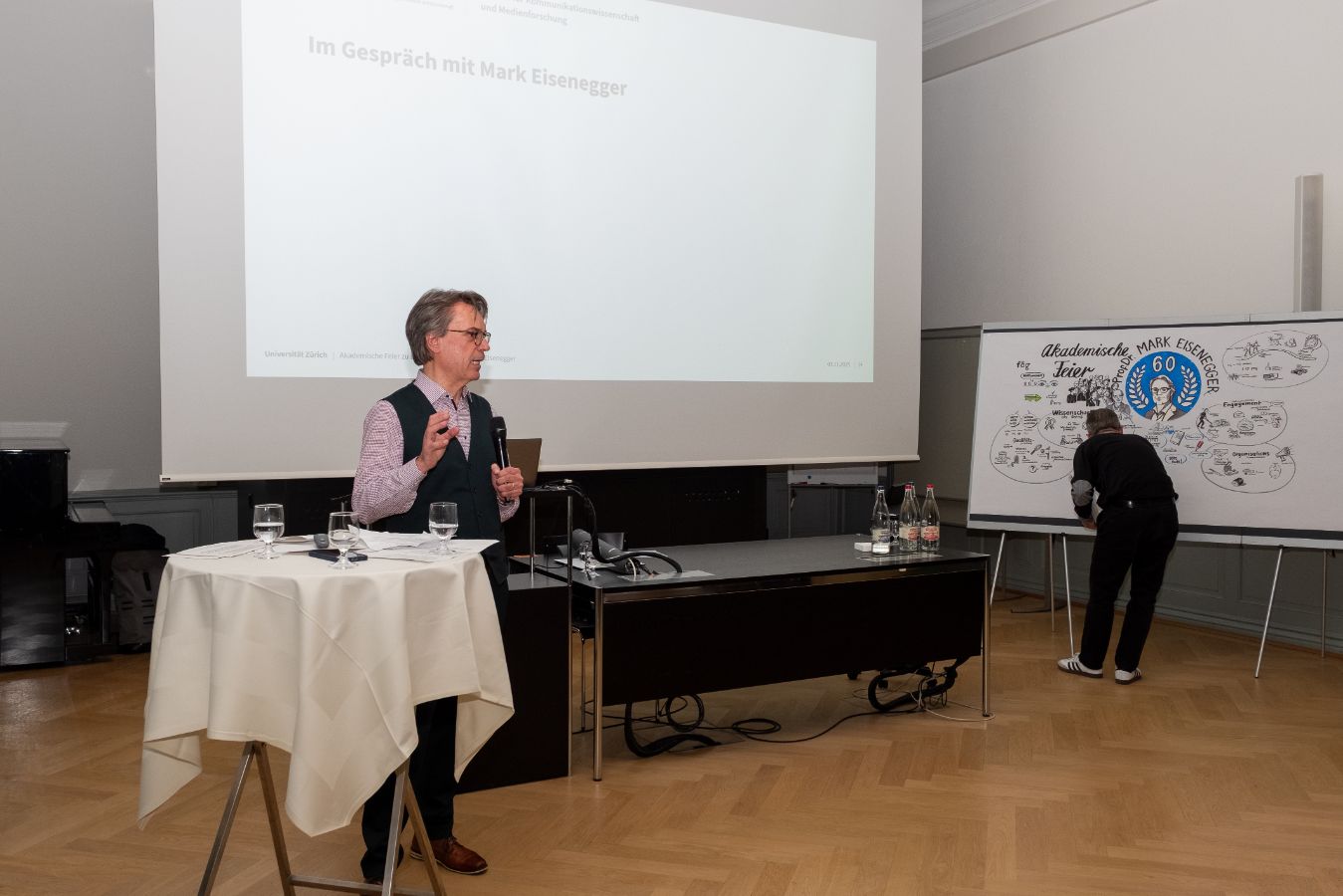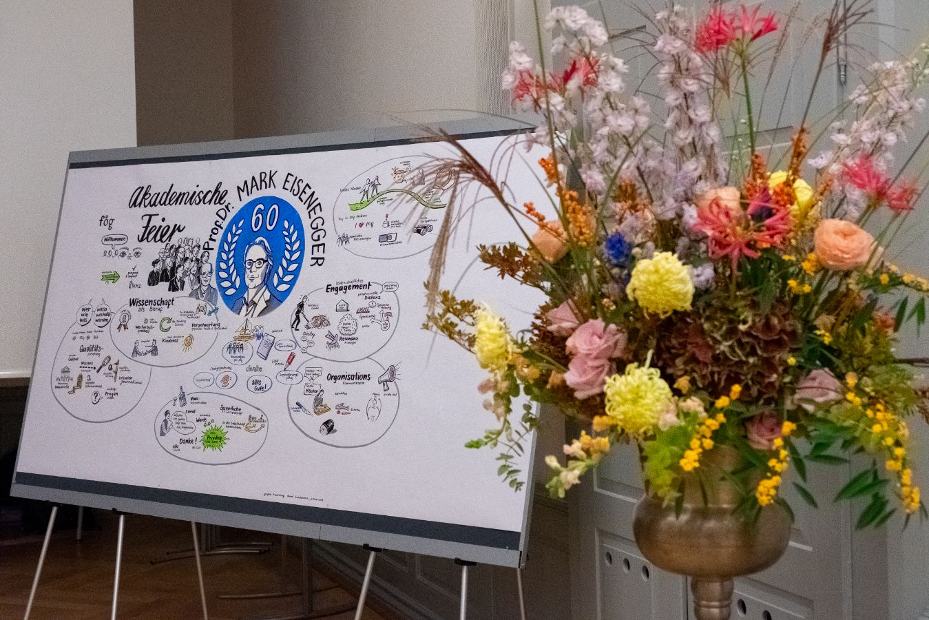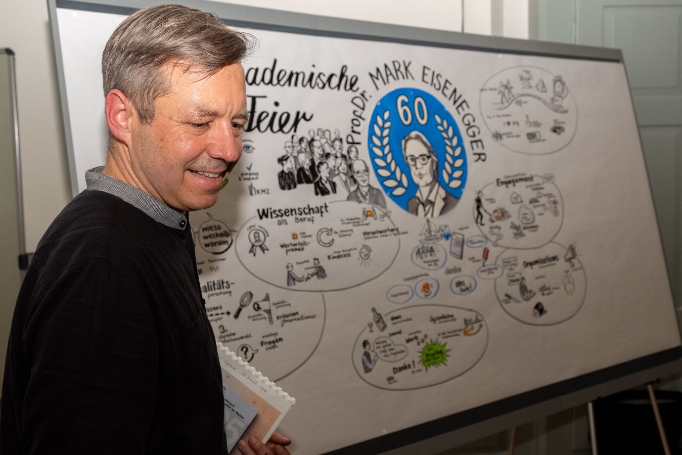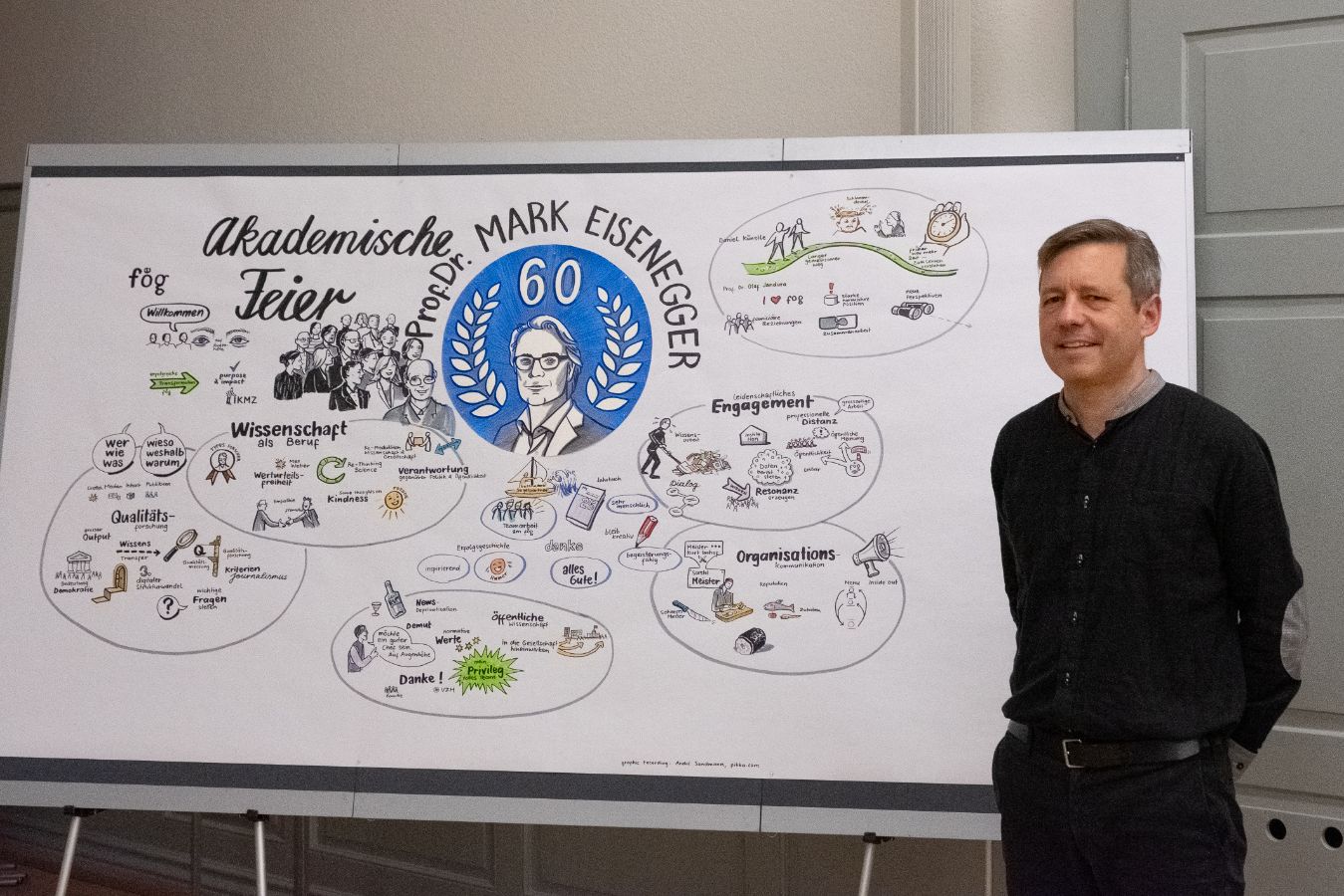 Am 7. November 2025 fand die akademische Feier anlässlich des 60. Geburtstags von Prof. Dr. Mark Eisenegger statt. Dabei wurden seine Verdienste in Kommunikationswissenschaft und Medienforschung durch verschiedene Beiträge gewürdigt. Neben Ansprachen von Prof. Dr. Mike Schäfer, Prof. Dr. Swaran Sandhu, Prof. Dr. Birgit Stark und Prof. Dr. Otfried Jarren kamen verschiedene Weggefährtinnen und Weggefährten zu Wort.