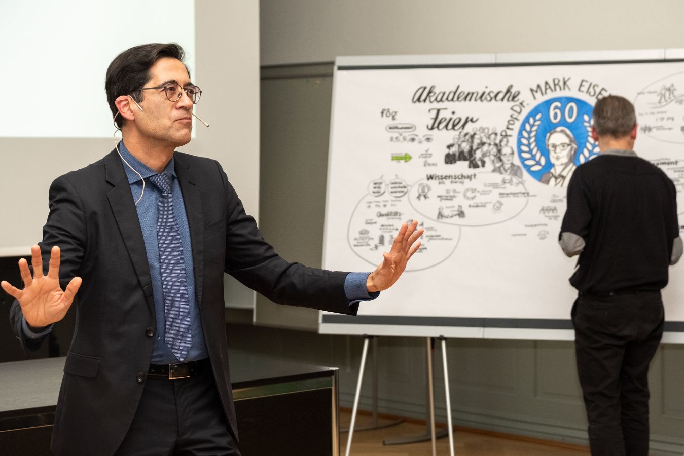 Am 7. November 2025 fand die akademische Feier anlässlich des 60. Geburtstags von Prof. Dr. Mark Eisenegger statt. Dabei wurden seine Verdienste in Kommunikationswissenschaft und Medienforschung durch verschiedene Beiträge gewürdigt. Neben Ansprachen von Prof. Dr. Mike Schäfer, Prof. Dr. Swaran Sandhu, Prof. Dr. Birgit Stark und Prof. Dr. Otfried Jarren kamen verschiedene Weggefährtinnen und Weggefährten zu Wort.