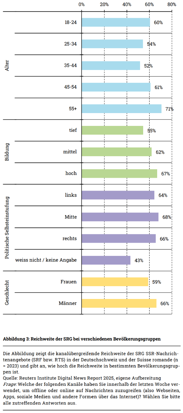 Die Resultate zeigen unter anderem, dass Nachrichtenangebote der SRG SSR kanalübergreifend 63% der Schweizer Bevölkerung erreichen. Das ist ein hoher Wert. Die Reichweite ist in allen Bevölkerungsgruppen hoch bis sehr hoch: bei jungen und älteren Menschen, bei Personen mit unterschiedlichem Bildungsniveau, bei Frauen und Männern sowie über das gesamte politische Spektrum hinweg (vgl. Abb. 3). Im europäischen Vergleich liegt die SRG SSR in Bezug auf die Reichweite im Durchschnitt.